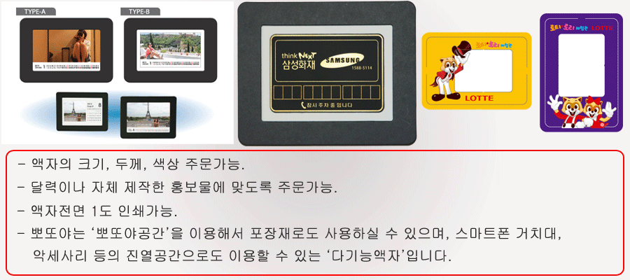 뽀또야 액자만의 "뽀또야공간"으로 인해 주차알림판 이외의 다양한 제품들의 포장재겸 액자로 활용하실 수 있습니다. |