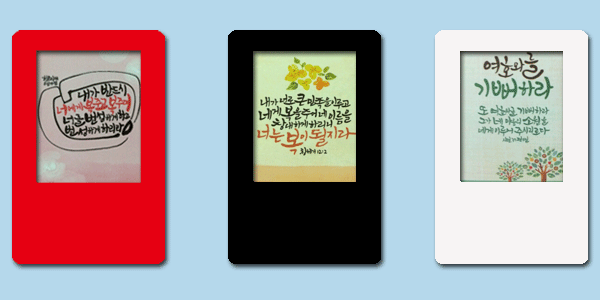제품규격 103mm X 69mm X 11mm 사진규격 폴라로이드 사진 성경말씀 150여 문구 색 상 Black, White, Red 재 질 앞/뒷면:종이 중간:EVA가 격 2,400원
